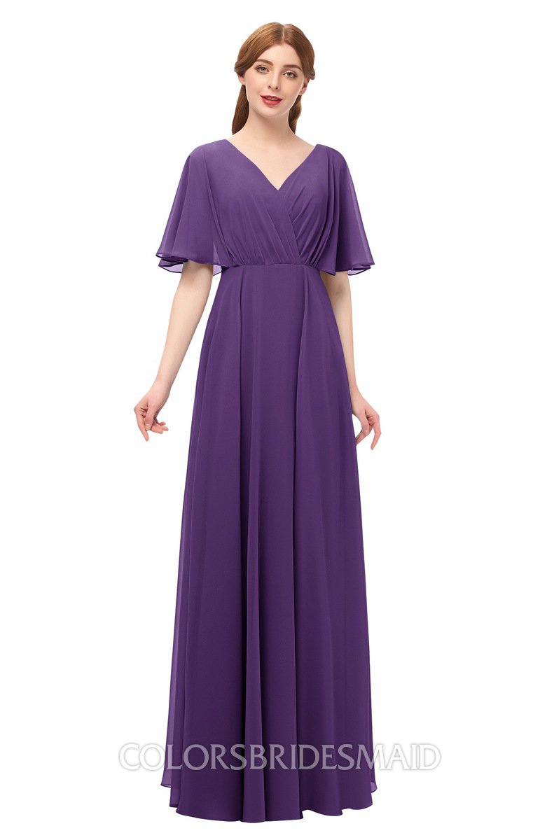 Dark Purple Bridesmaid Dresses A-line Short Sleeve Floor Length Sexy Zip up Pleated