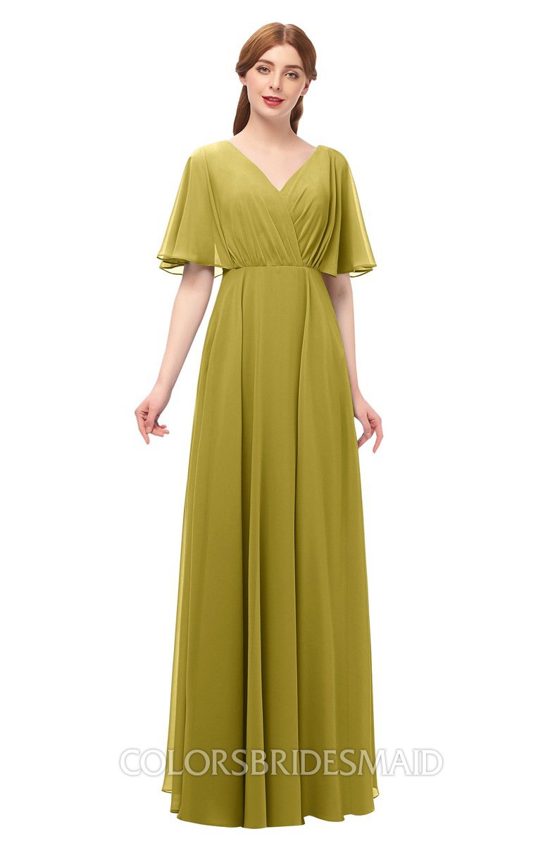 Golden Olive Bridesmaid Dresses A-line Short Sleeve Floor Length Sexy Zip up Pleated