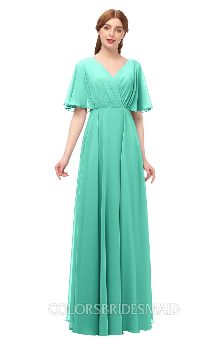 Seafoam Green Bridesmaid Dresses A-line Short Sleeve Floor Length Sexy Zip up Pleated