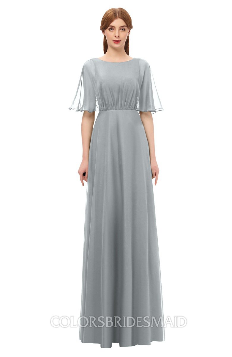 Frost Grey Bridesmaid Dresses Floor Length Zipper Elbow Length Sleeve Glamorous Pleated Jewel