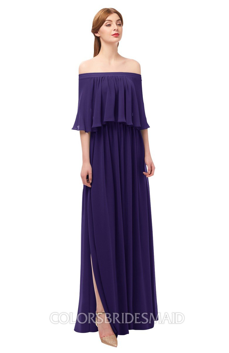 Royal Purple Bridesmaid Dresses Glamorous Zipper Ruching Floor Length Off The Shoulder Short Sleeve