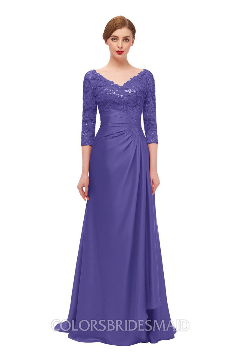 Purple Opulence Bridesmaid Dresses Luxury Zipper Three-fourths Length Sleeve Brush Train Lace V-neck