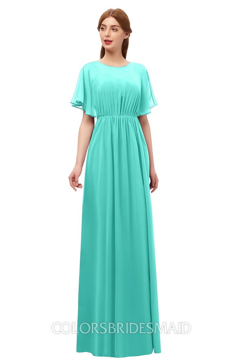 Blue Turquoise Bridesmaid Dresses Pleated Modern Jewel Short Sleeve Lace up Floor Length