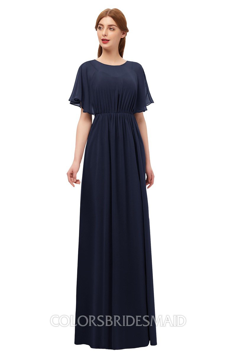Dark Sapphire Bridesmaid Dresses Pleated Modern Jewel Short Sleeve Lace up Floor Length