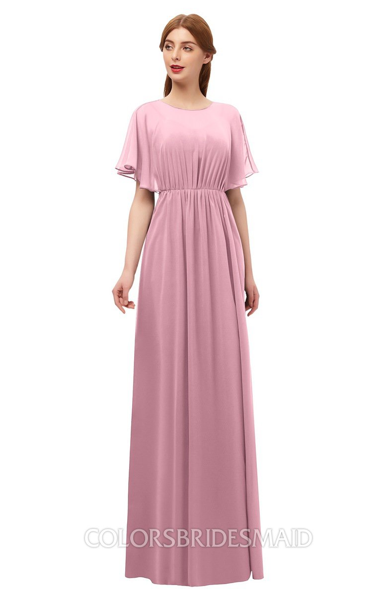 Light Coral Bridesmaid Dresses Pleated Modern Jewel Short Sleeve Lace up Floor Length