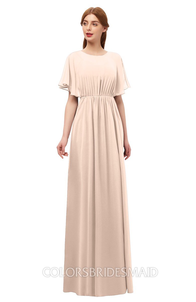 Peach Puree Bridesmaid Dresses Pleated Modern Jewel Short Sleeve Lace up Floor Length