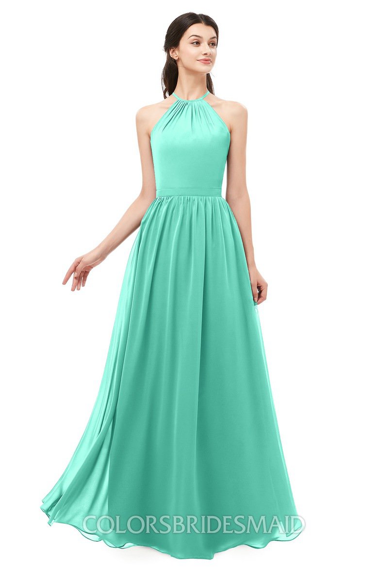 3. ColsBM Ivanna Mint Green Elegant A-line Halter Sleeveless Floor Length Flower Bridesmaid Dresses