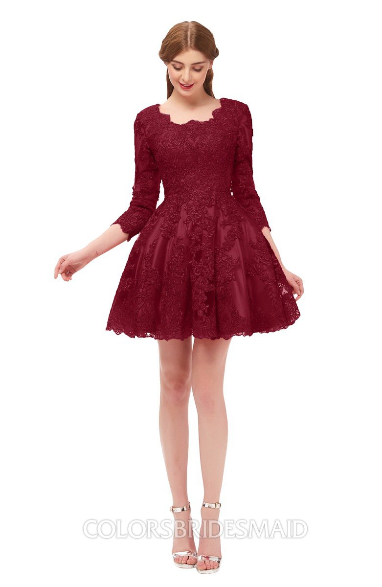Burgundy Bridesmaid Dresses Zipper Three-fourths Length Sleeve Baby Doll Cute Mini Lace
