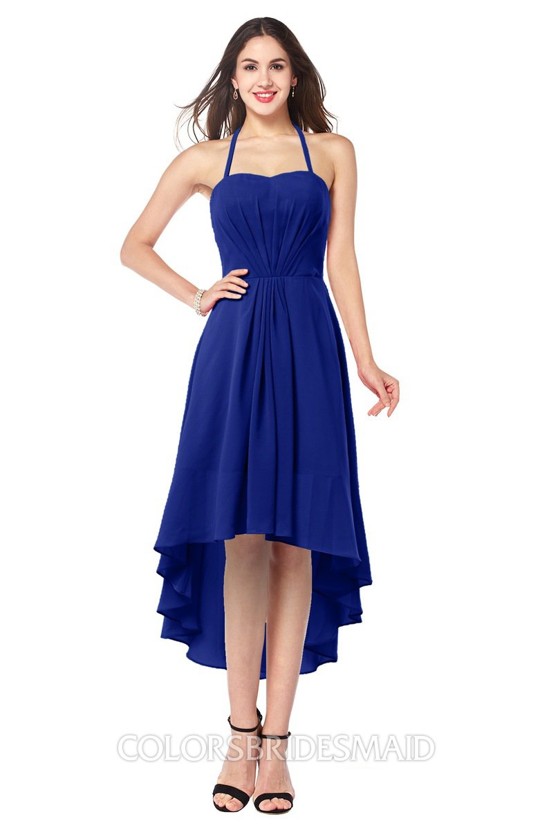 Electric Blue Casual A-line Halter Half Backless Asymmetric Ruching Plus Size Bridesmaid Dresses
