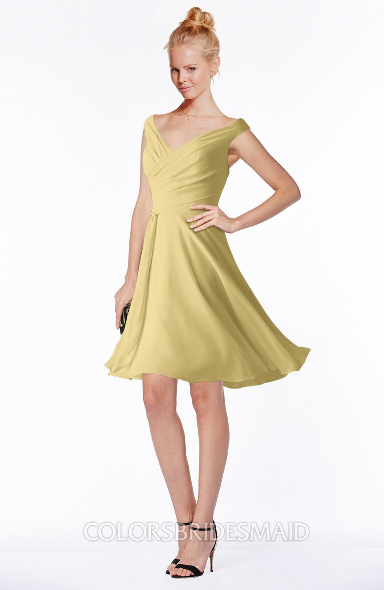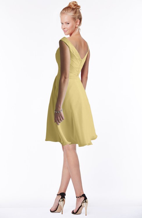 Gold Classic Fit-n-Flare Zip up Chiffon Knee Length Ruching Bridesmaid Dresses