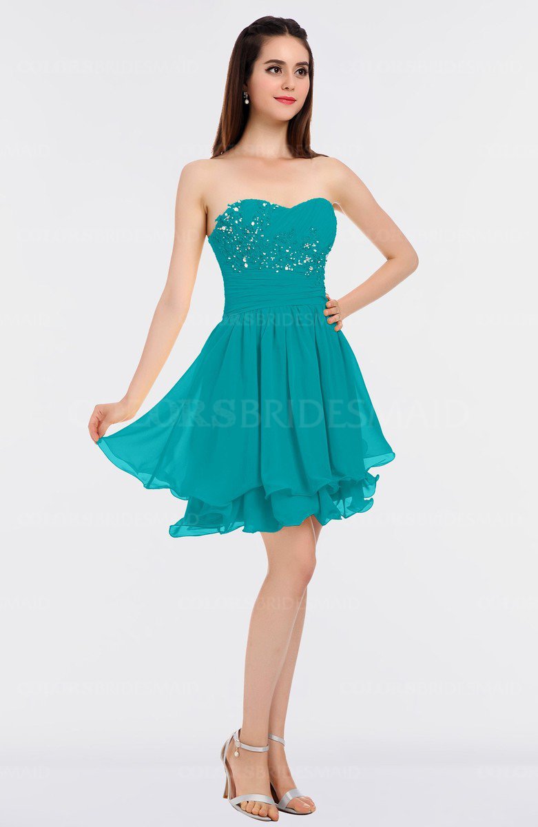 Peacock Blue Glamorous A-line Strapless Sleeveless Mini Beaded Bridesmaid Dresses