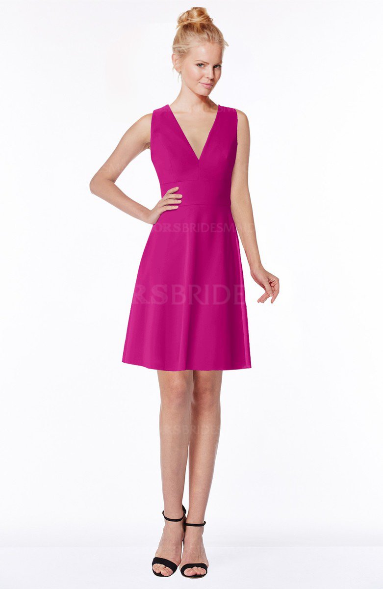 Hot Pink Glamorous Fit-n-Flare V-neck Zip up Chiffon Knee Length Bridesmaid Dresses