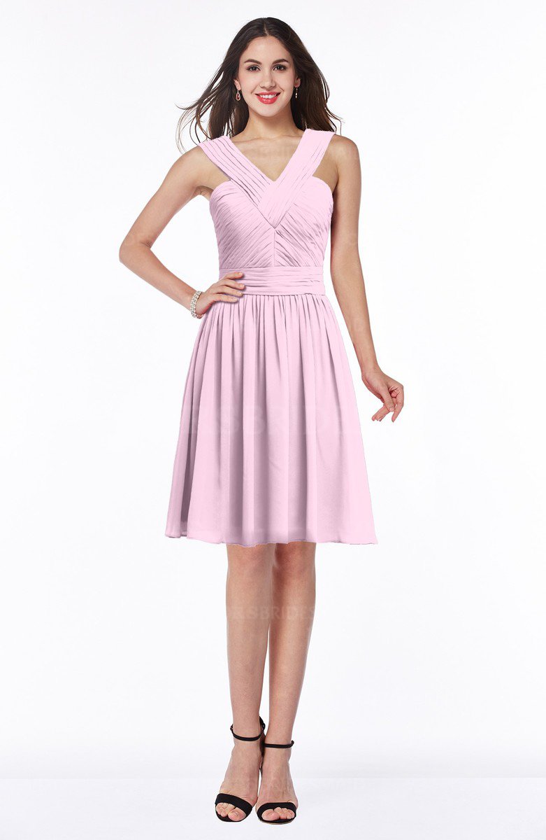 Baby Pink Modest Trumpet V-neck Sleeveless Knee Length Bridesmaid Dresses