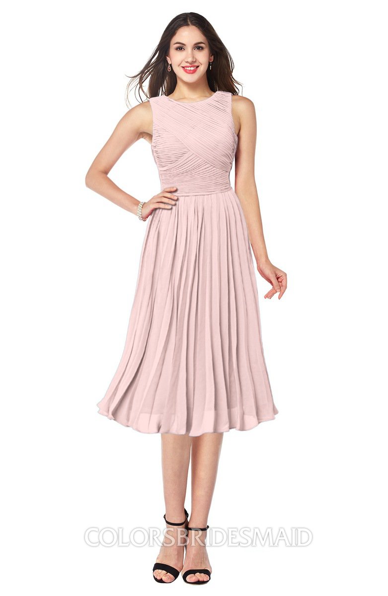 Pastel Pink Traditional A-line Jewel Sleeveless Tea Length Pleated Plus Size Bridesmaid Dresses
